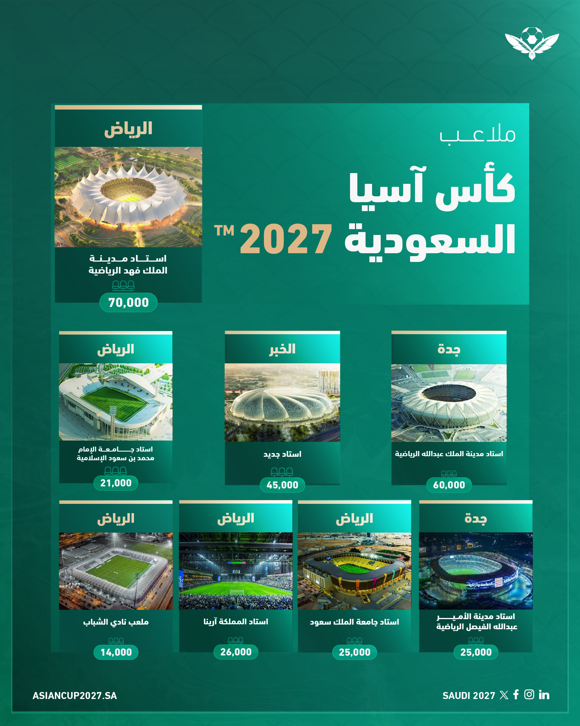 وذكرت أن القائمة تضم ملعب جامعة الملك سعود، واستاد نادي الشباب، وملعب المملكة أرينا في مدينة الرياض، بالإضافة إلى ملعب جامعة الإمام محمد بن سعود الذي ينتظره مشروع تطوير يشمل زيادة الطاقة الاستيعابية للمدرجات إلى 21 ألف مشجع، إلى جانب تطوير كافة المرافق والملعب الرئيسي ليكون متوافقاً مع متطلبات الاتحاد الآسيوي لكرة القدم، واستاد مدينة الأمير عبدالله الفيصل الرياضية بجدة، والذي استضاف عدداً من مباريات بطولة كأس العالم للأندية 2023.