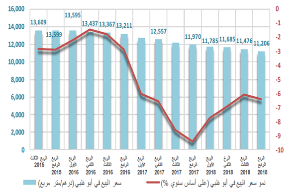 وفيما يخص سوق العقارات في أبوظبي قال المصرف المركزي إن أسعار العقارات السكنية واصلت التراجع بمعدل سنوي بلغ 6.4% خلال الربع الرابع من العام الماضي مقارنة بالربع الرابع 2017، بعد انخفاض سنوي بنسبة 6.1 % في الربع الذي سبقه، وذلك وفقاً لمؤشر أسعار "ريدين".