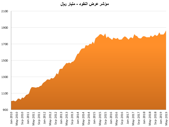 وفيما يلي جدول يوضح التطور الشهري لعرض النقود بمفهومه الواسع (ن 3) في السعودية بين عامي 2019 و2018: