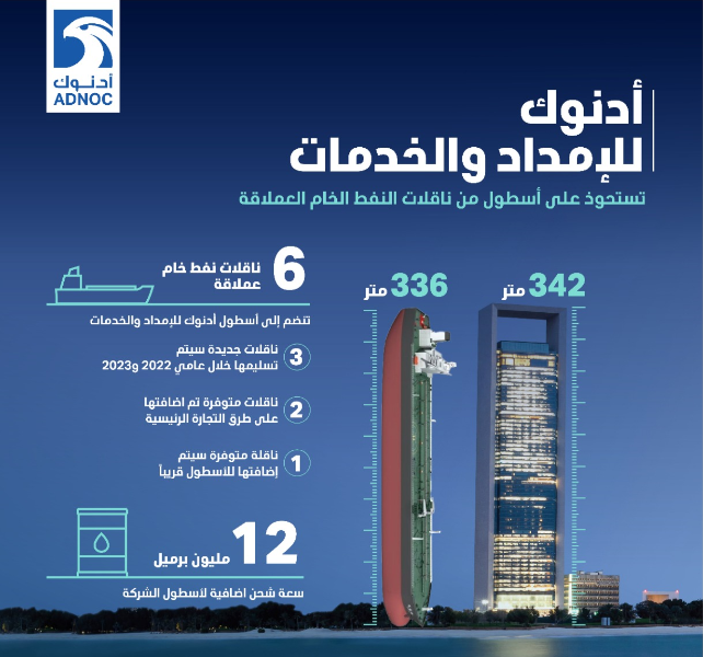 وبإضافة هذه الناقلات، التي تعد الأولى من نوعها في أسطول أدنوك للإمداد والخدمات، يرتفع إجمالي طاقة الشحن للشركة بواقع 12 مليون برميل من النفط الخام.
