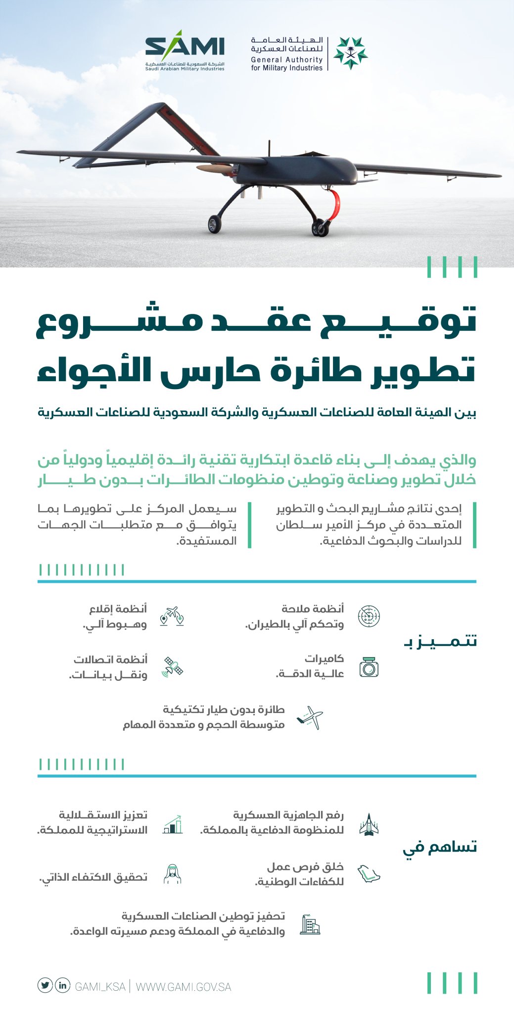 وقعت الهيئة العامة للصناعات العسكرية، اليوم، عقد تطوير طائرة حارس الأجواء (طائرة بدون طيار) مع الشركة السعودية للصناعات العسكرية.