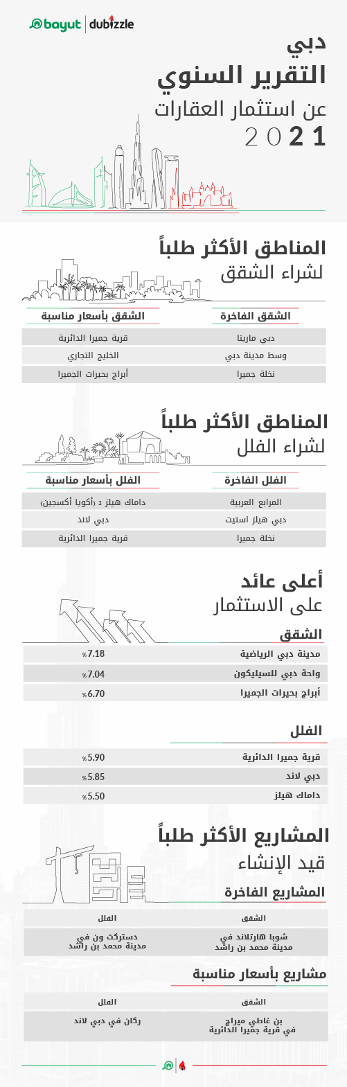 - كانت داماك "هيلز2 " و"قرية جميرا الدائرية" المنطقتين الأكثر بحثاً من قبل المشترين المحتملين الباحثين عن فلل وشقق بأسعار معقولة على التوالي، في حين فضل المستثمرون الباحثون عن عقارات فاخرة المناطق والمجمعات التي تمتاز بتوفير خدمات متكاملة مثل "دبي مارينا" ووسط مدينة دبي للشقق، والمرابع العربية ودبي هيلز استيت للفلل.