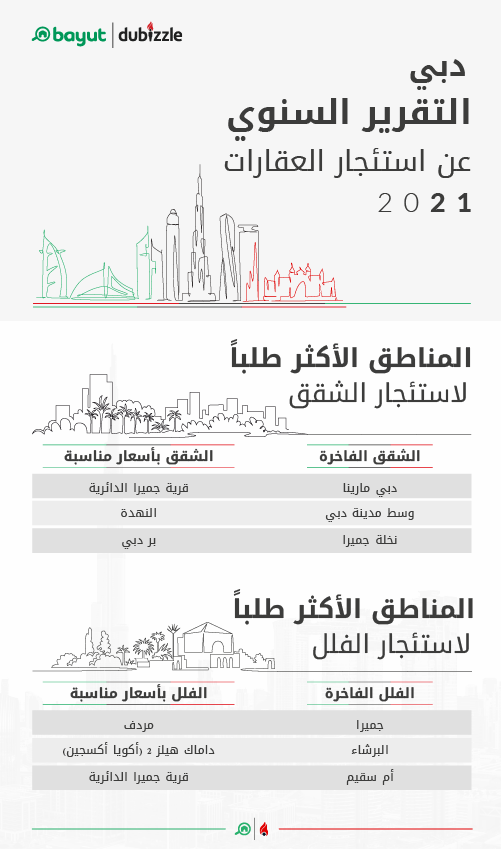 - تصدرت قرية جميرا الدائرية قائمة المناطق الأكثر طلباً لاستئجار الشقق ذات الأسعار المعقولة خلال عام 2021.