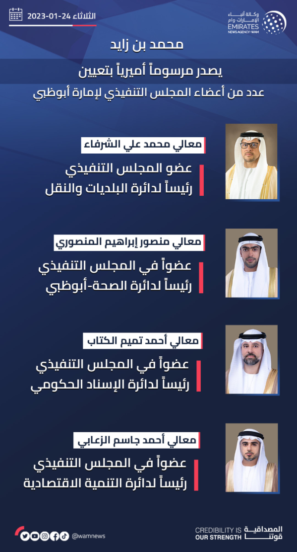 ونصّ المرسوم على تعيين محمد علي الشرفاء عضو المجلس التنفيذي رئيسًا لدائرة البلديات والنقل، وتعيين منصور إبراهيم المنصوري عضواً بالمجلس التنفيذي رئيساً لدائرة الصحة - أبوظبي، وتعيين أحمد تميم الكتاب عضواً بالمجلس التنفيذي رئيساً لدائرة الإسناد الحكومي، وتعيين أحمد جاسم الزعابي عضواً بالمجلس التنفيذي رئيساً لدائرة التنمية الاقتصادية.