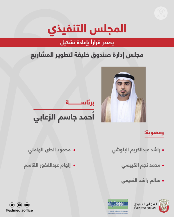 أصدر المجلس التنفيذي لإمارة أبوظبي قراراً بإعادة تشكيل مجلس إدارة صندوق خليفة لتطوير المشاريع.