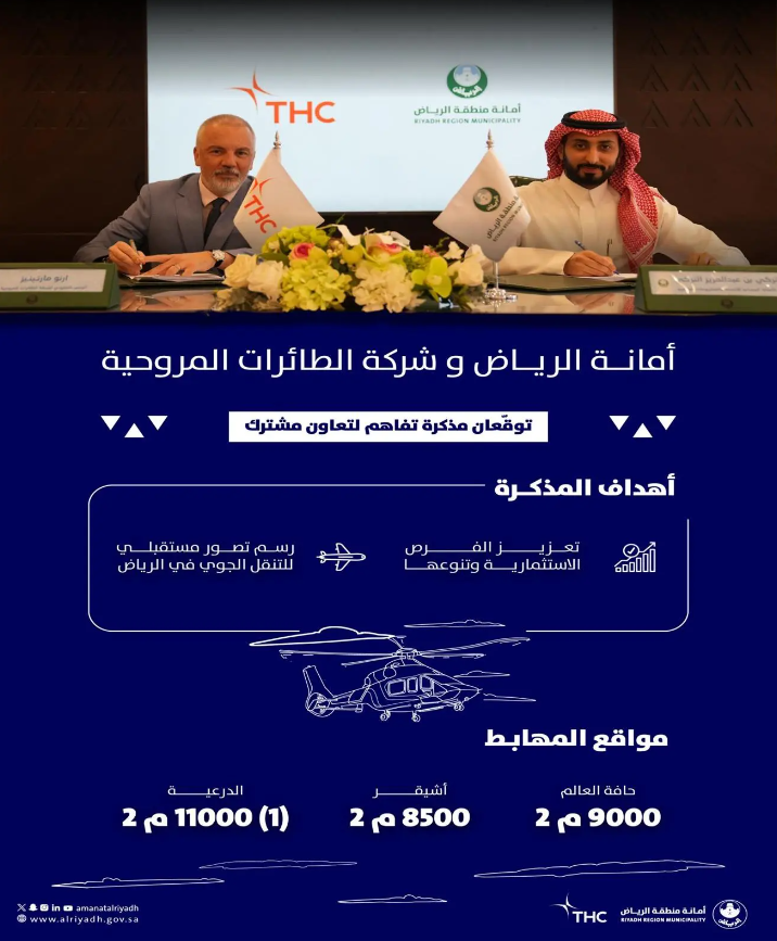وقّعت أمانة منطقة الرياض مذكرة تفاهم مع شركة الطائرات المروحية، لاستخدام الأراضي مهابط للطائرات المروحية، بالإضافة إلى تحديد فرص التعاون للتنقل الجوي في مدينة الرياض.