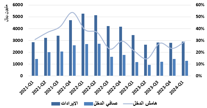 والرسم التالي يوضح تطور الإيرادات والأرباح الصافية وهامش الدخل منذ بداية عام 2021: