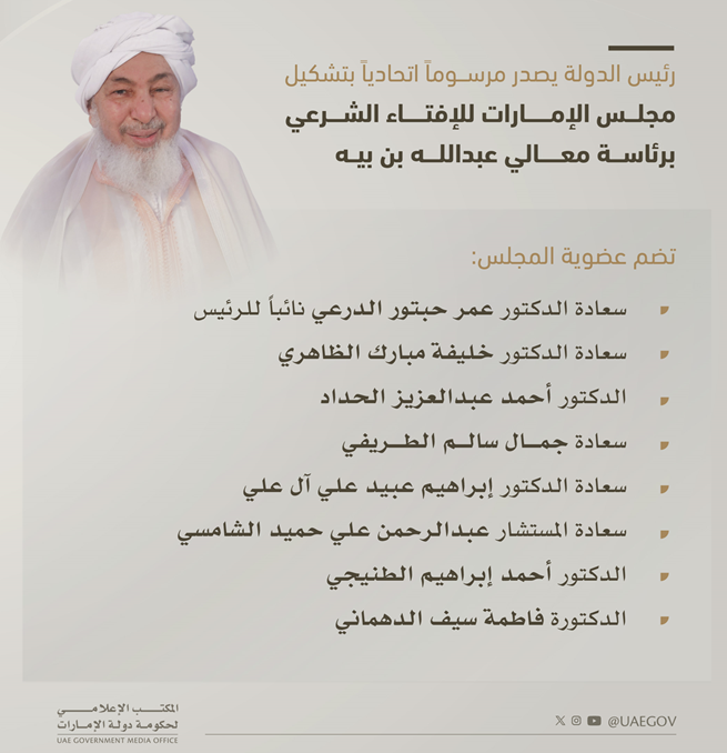 أصدر الشيخ محمد بن زايد آل نهيان، رئيس الدولة مرسوماً اتحادياً بتشكيل مجلس الإمارات للإفتاء الشرعي، ومرسوماً اتحادياً آخر بتعيين عبدالله بن بيه رئيساً للمجلس بدرجة وزير.