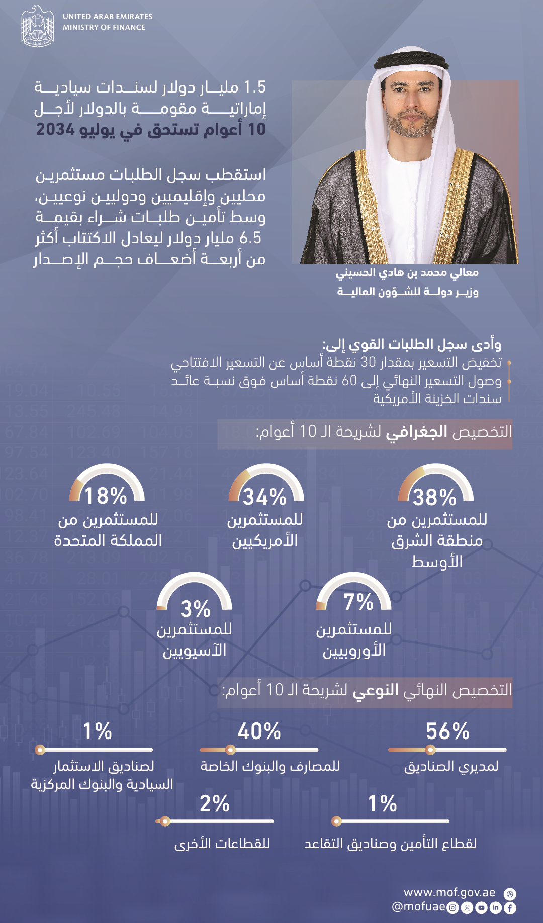 وأشار محمد بن هادي الحسيني، وزير دولة للشؤون المالية إلى أن سجل الطلبات القوي أدى إلى تخفيض التسعير بمقدار 30 نقطة أساس عن التسعير الافتتاحي، مع وصول التسعير النهائي إلى 60 نقطة أساس فوق نسبة عائد سندات الخزينة الأمريكية.