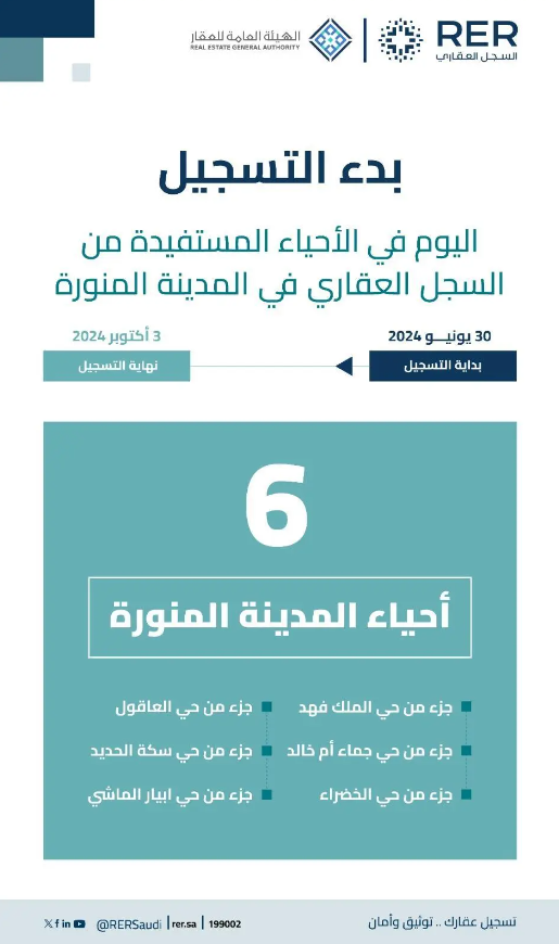 وكانت الهيئة العامة للعقار قد أعلنت عن تحديد الأحياء الستة ضمن المناطق المستفيدة من السجل العقاري التي يتم تحديدها وفقًا لمعايير عدة وذلك انطلاقًا من دور الهيئة كونها الجهة المختصة بالتسجيل العيني للعقار وفقًا لقرار مجلس الوزراء وأحكام نظام التسجيل العيني للعقار، وتتول الشركة الوطنية لخدمات التسجيل العيني للعقار (السجل العقاري) تنفيذ أعمال إنشاء وإدارة السجل العقاري في المملكة باستخدام التقنيات والبيانات الجيومكانية والتقنيات الحديثة من خلال منصة رقمية متكاملة تُسهم في تعزيز الشفافية والثقة في خدمات وبيانات العقارات.