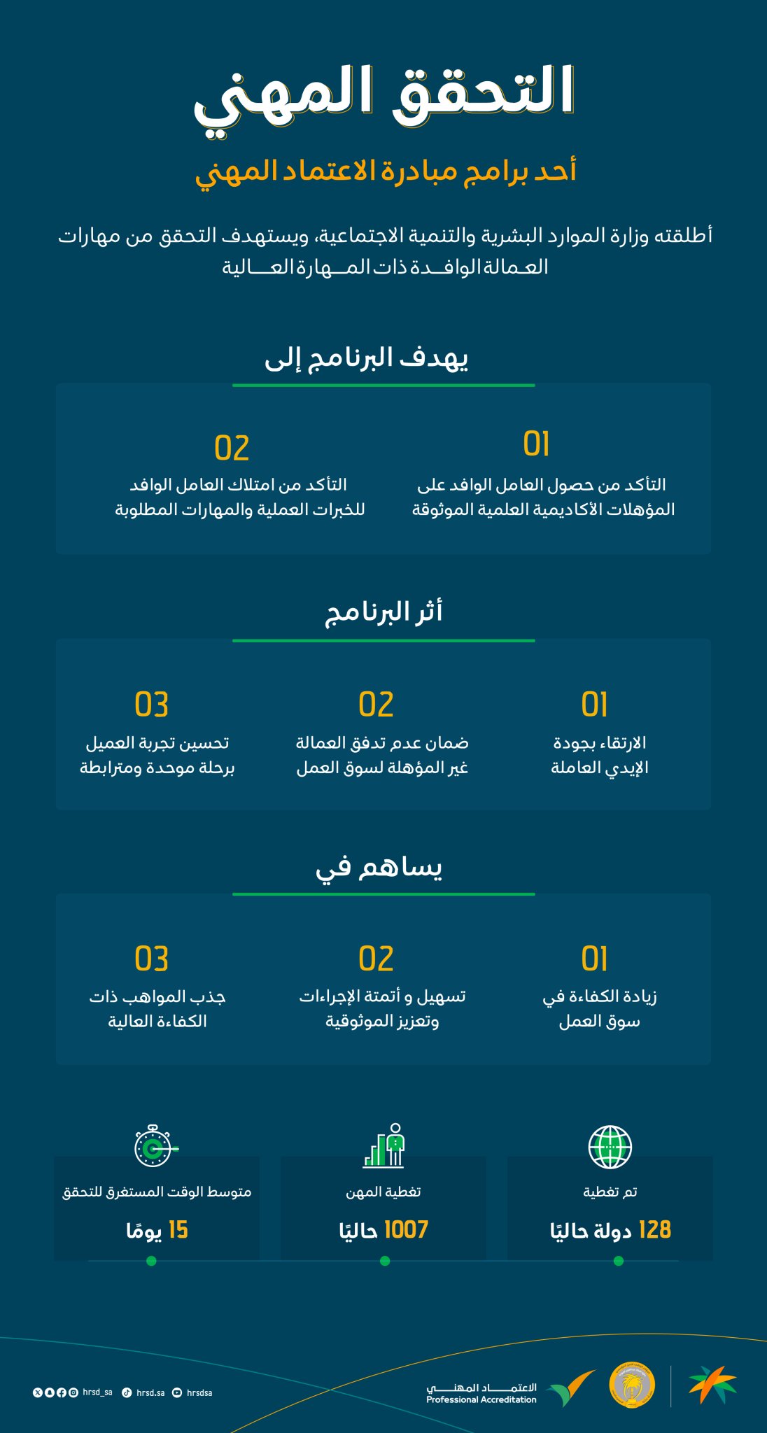 أكملت وزارة الموارد البشرية المرحلة الأولى من خدمة "التحقق المهني" ضمن برنامج "الاعتماد المهني" وتغطية 128 دولة وذلك بالتعاون مع وزارة الخارجية من خلال منصة إلكترونية موحدة تشرف عليها الوزارة.