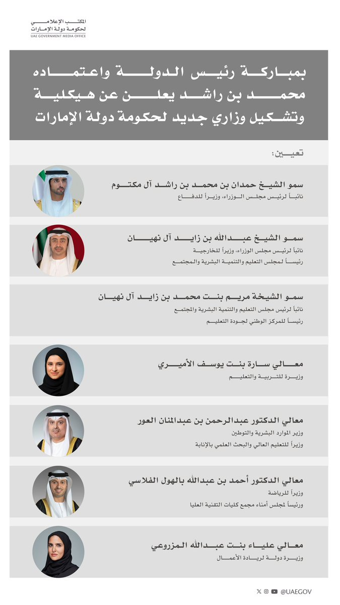 وقال في حسابه على منصة إكس: الإخوة والأخوات، بعد التشاور مع أخي الشيخ محمد بن زايد رئيس الدولة وبعد مباركته واعتماده، واستمراراً للتطوير المستمر في هيكلية حكومة دولة الإمارات، نعلن اليوم عن تشكيل وزاري جديد في الدولة كالتالي :