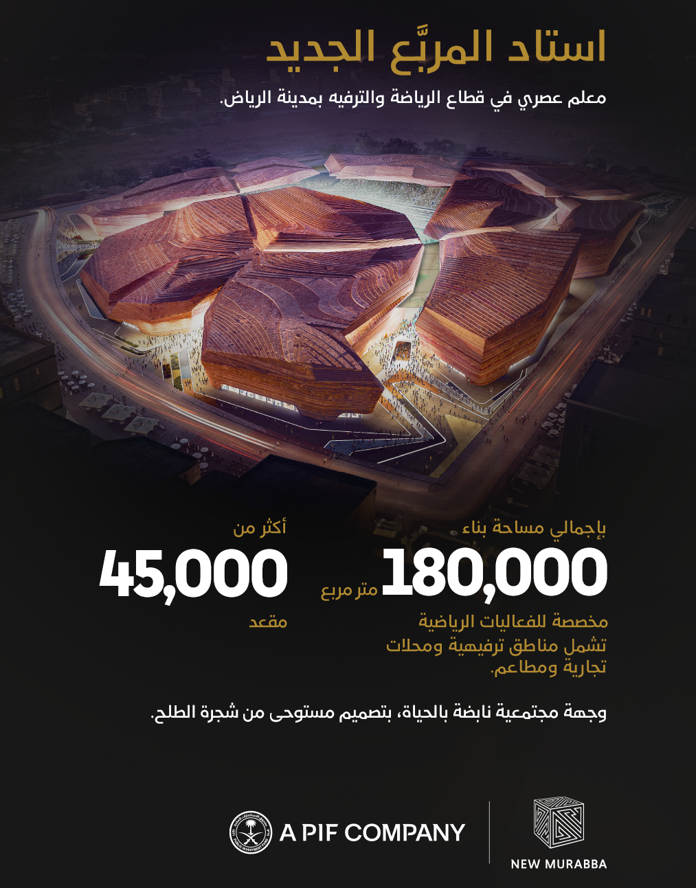 أعلنت شركة تطوير المربَّع الجديد، إحدى شركات صندوق الاستثمارات العامة، تصميم مشروع "استاد المربَّع الجديد"، في مدينة الرياض بطاقة استيعابية تزيد عن 45 ألف مقعد.