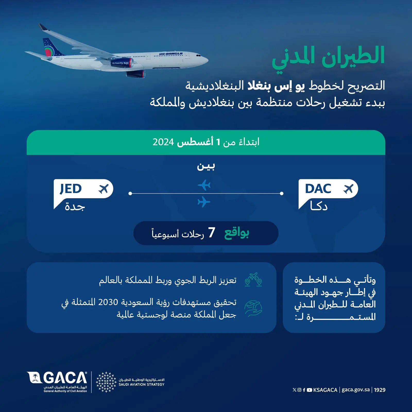 هيئة الطيران المدني : التصريح ببدء تشغيل الخطوط الجوية البنغلاديشية برحلات منتظمة بين المملكة وبنغلاديش من 1 أغسطس