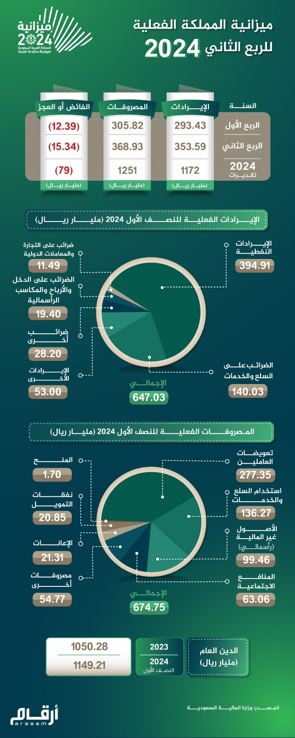 وبلغت المصروفات الفعلية للنصف الأول 2024، نحو 674.75 مليار ريال، بارتفاع بلغ 12% مقارنة بنفس الفترة من العام الماضي، كما يظهر أدناه: