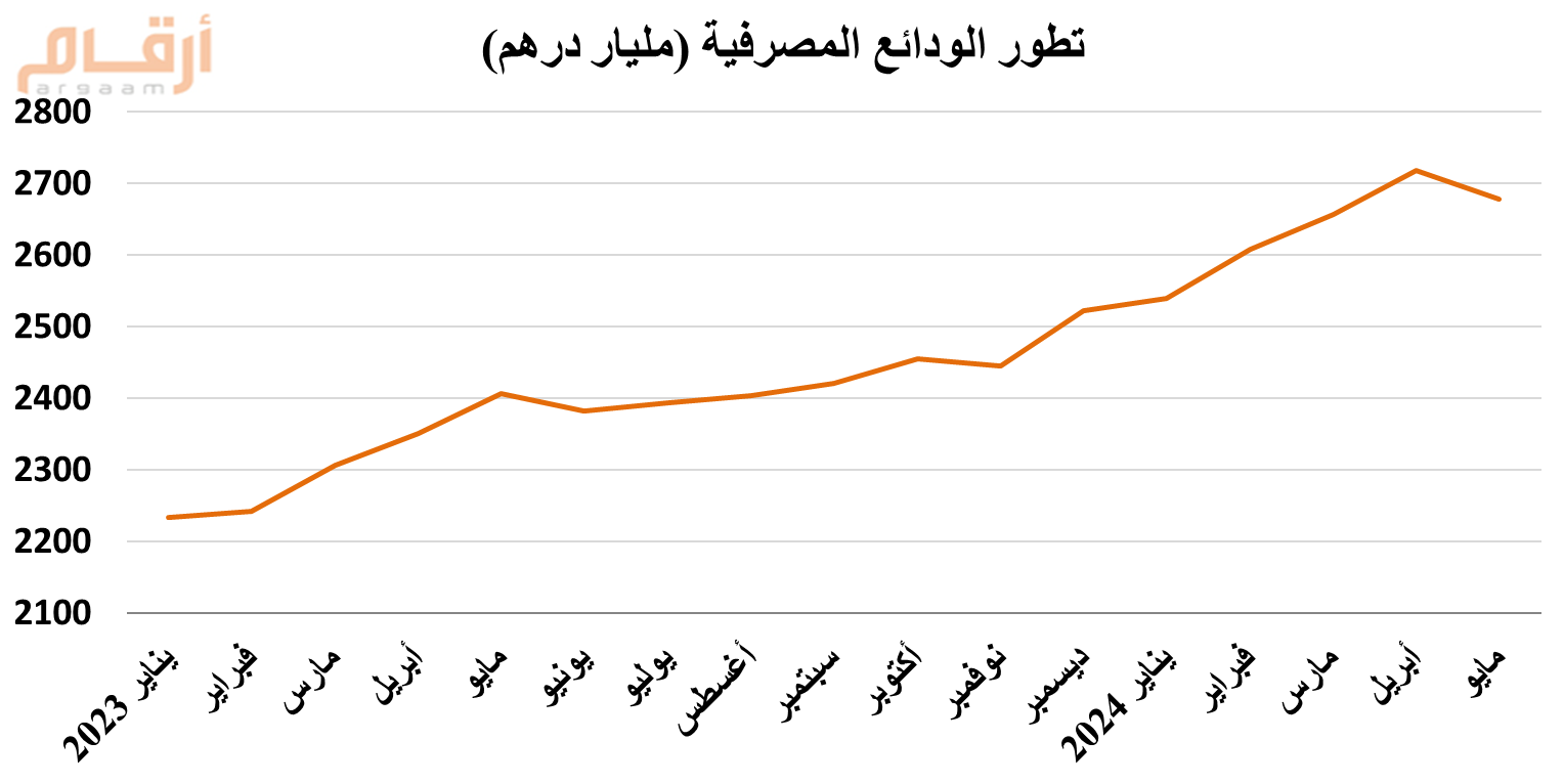 ووفقا لأحدث إحصائيات مصرف الإمارات المركزي، ارتفعت الودائع المصرفية إلى 2678.2 مليار درهم بنهاية مايو 2024، وبـنسبة 11.3% مقارنة بنفس الفترة من عام 2023، وانخفضت بقيمة 39.3 مليار درهم مقارنة بشهر أبريل الماضي.