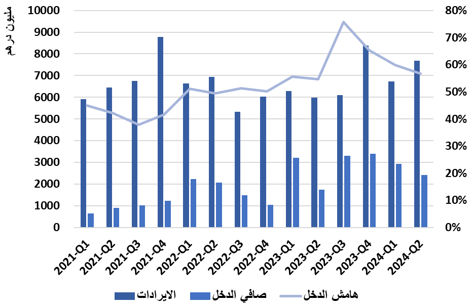 والرسم التالي يوضح تطور الإيرادات والأرباح الصافية وهامش الدخل منذ بداية عام 2022: