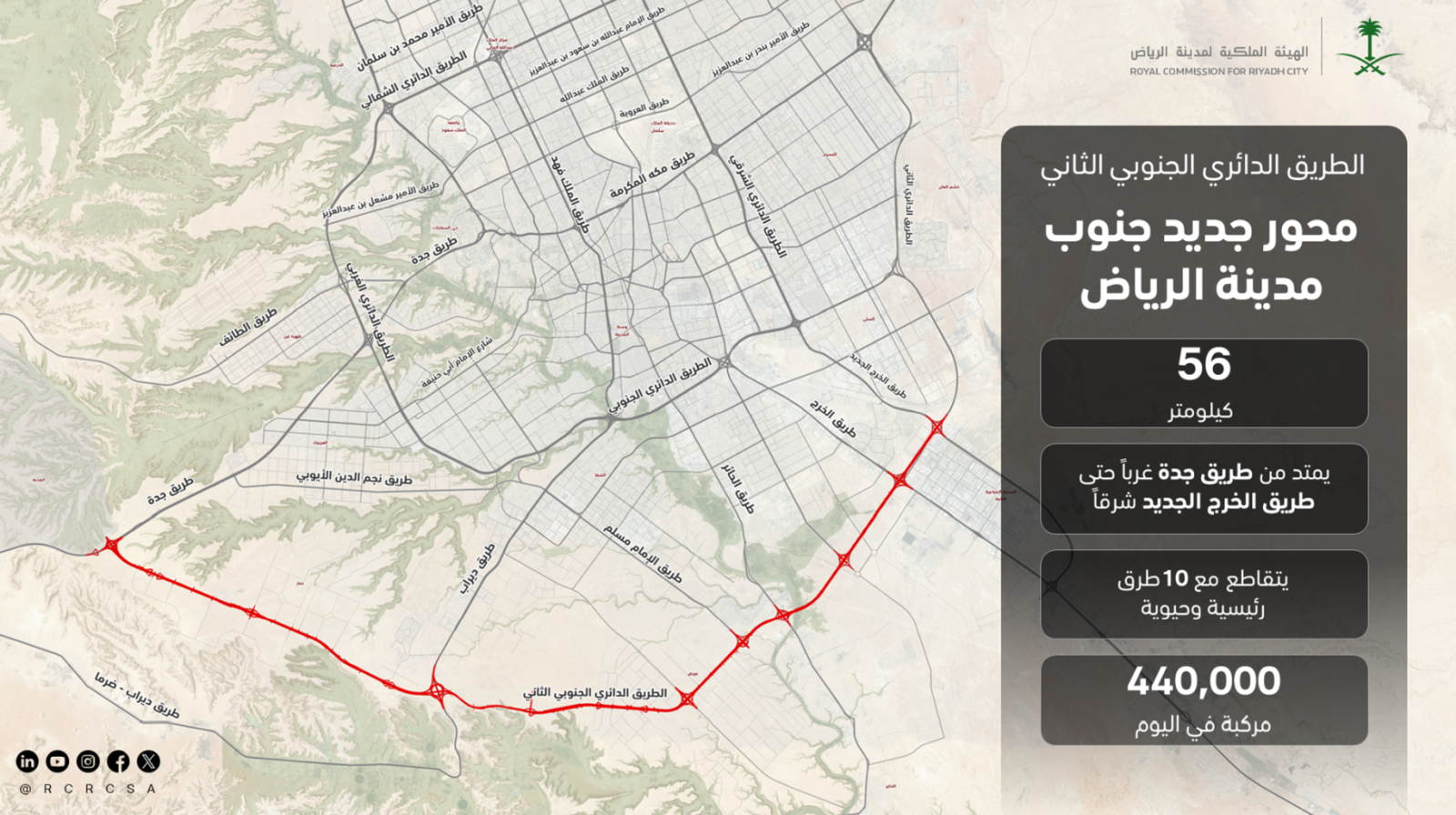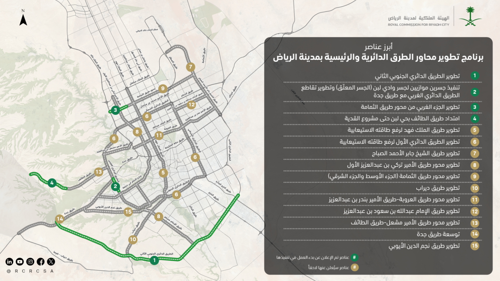 يشار الى أن برنامج تطوير محاور الطرق الدائرية والرئيسة بمدينة الرياض يشتمل على تنفيذ وتطوير 500 كيلومتر من عناصر شبكة الطرق، عبر إضافة طرق جديدة ورفع مستوى المحاور القائمة وربطها ببعضها البعض.