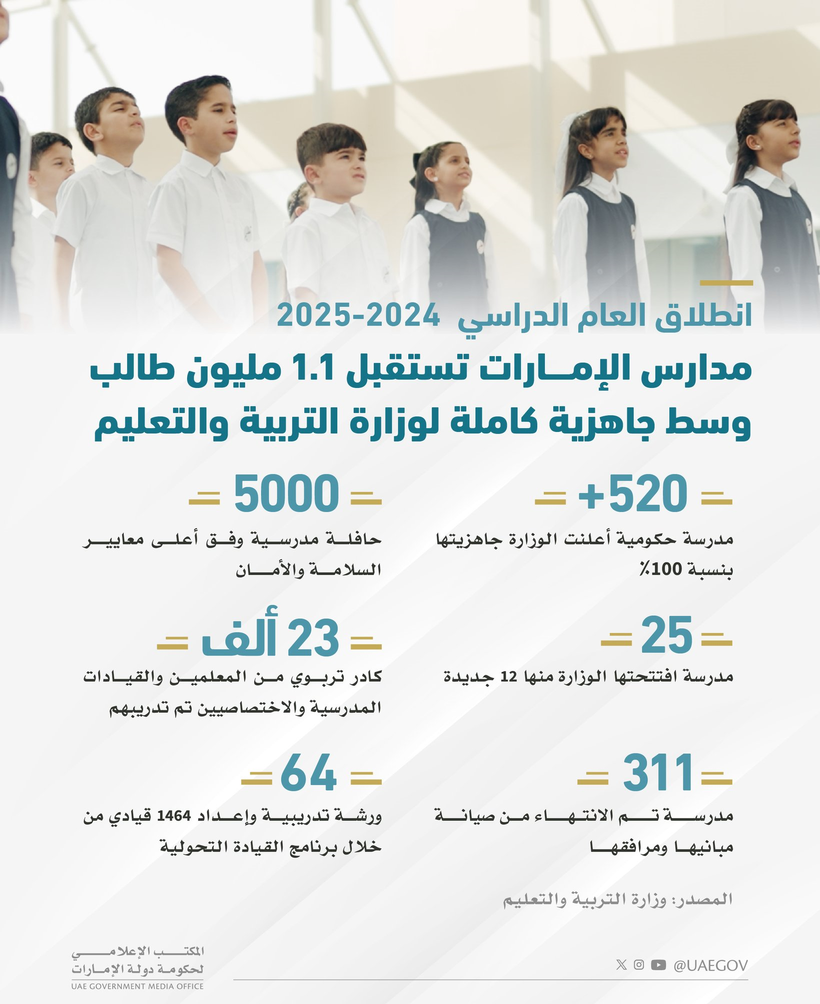 يبدأ اليوم الإثنين الموافق لـ 26 أغسطس، العام الدراسي الجديد في الإمارات 2024 – 2025، حيث ينتظم نحو 1.1 مليون طالب وطالبة في المدارس ورياض الأطفال، منهم نحو 26% في مدارس حكومية.