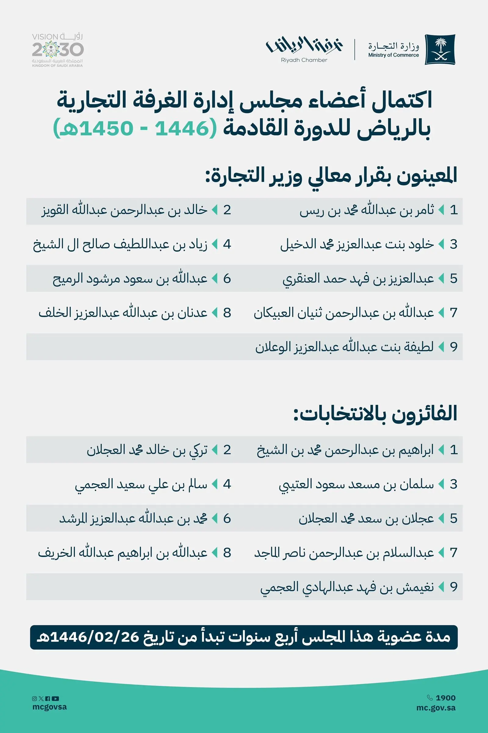 وبهذا التعيين يكتمل النصاب القانوني لأعضاء مجلس إدارة الغرفة بعدد 18 عضوا، حيث أعلنت الوزارة في 26 محرم 1446 هـ، عن فوز 9 مترشحين في الانتخابات، وهم: إبراهيم بن عبدالرحمن محمد بن الشيخ، وتركي بن خالد محمد العجلان، وسلمان بن مسعد سعود العتيبي، وسالم بن علي سعيد العجمي، وعجلان بن سعد محمد العجلان، ومحمد بن عبدالله عبدالعزيز المرشد، وعبدالسلام بن عبدالرحمن ناصر الماجد، وعبدالله بن ابراهيم عبدالله الخريف، ونغيمش بن فهد عبدالهادي العجمي، وستكون مدة عضوية مجلس الإدارة أربع سنوات اعتباراً من 26/ 2 / 1446هـ.