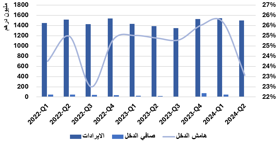 وعلى أثر ذلك انخفضت هوامش الربح الإجمالي للشركة بمقدار 1.8% عن الربع المماثل، لتصل إلى 23.1% مقارنة بـ 24.9% خلال الربع الثاني 2023، نتيجة ارتفاع التكاليف المباشرة بنسبة أكبر من ارتفاع الإيرادات.