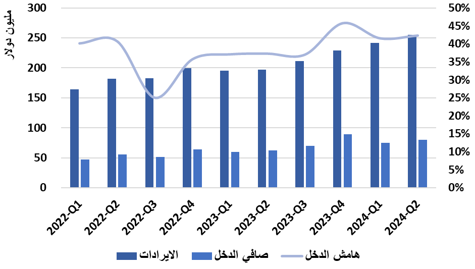 والرسم البياني التالي يوضح تطور الإيرادات وصافي الدخل وهامش الدخل منذ بداية العام 2022: