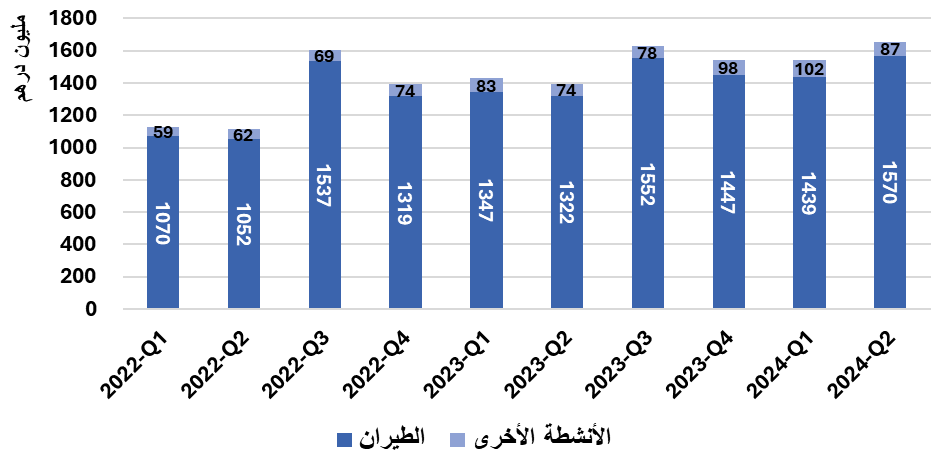 وعلى الجانب الآخر: فقد ارتفعت إيرادات القطاع الرئيسي "قطاع الطيران" بنحو 19%، لتصل إلى 1569.6 مليون درهم خلال الربع الحالي، مقارنة بـ 1321.7 مليون درهم خلال الربع الثاني 2023، وبنسبة 9% عن الربع السابق، مدفوعة بالطلب القوي على السفر الجوي وارتفاع أعداد المسافرين بنسبة 19%، وارتفاع معدل الإشغال بنسبة 3% عن الربع المقارنة من عام 2023.