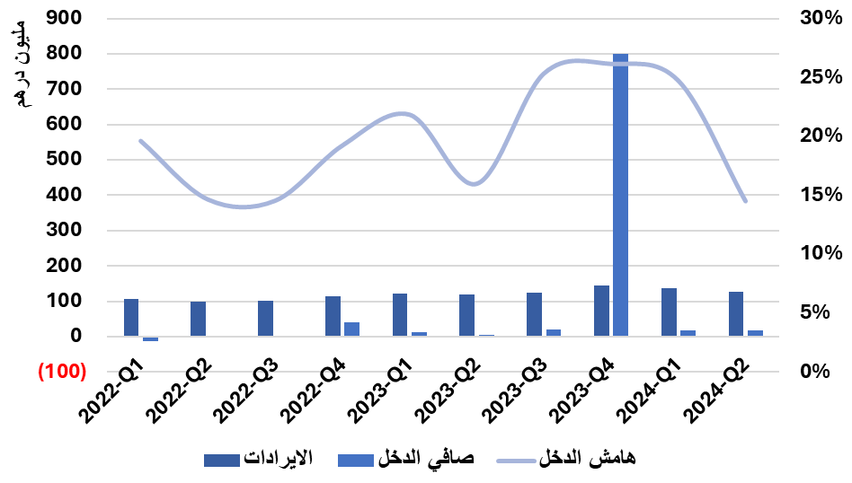 وعلى أثر ذلك تحسنت الإيرادات من العقود المبرمة مع العملاء للشركة ككل بنحو 8% لتبلغ 127.7 مليون درهم خلال الربع الحالي، مقارنة بـ 118.7 مليون درهم خلال الربع الثاني 2023، إلا أنها انخفضت بنسبة 8% عن الربع السابق.