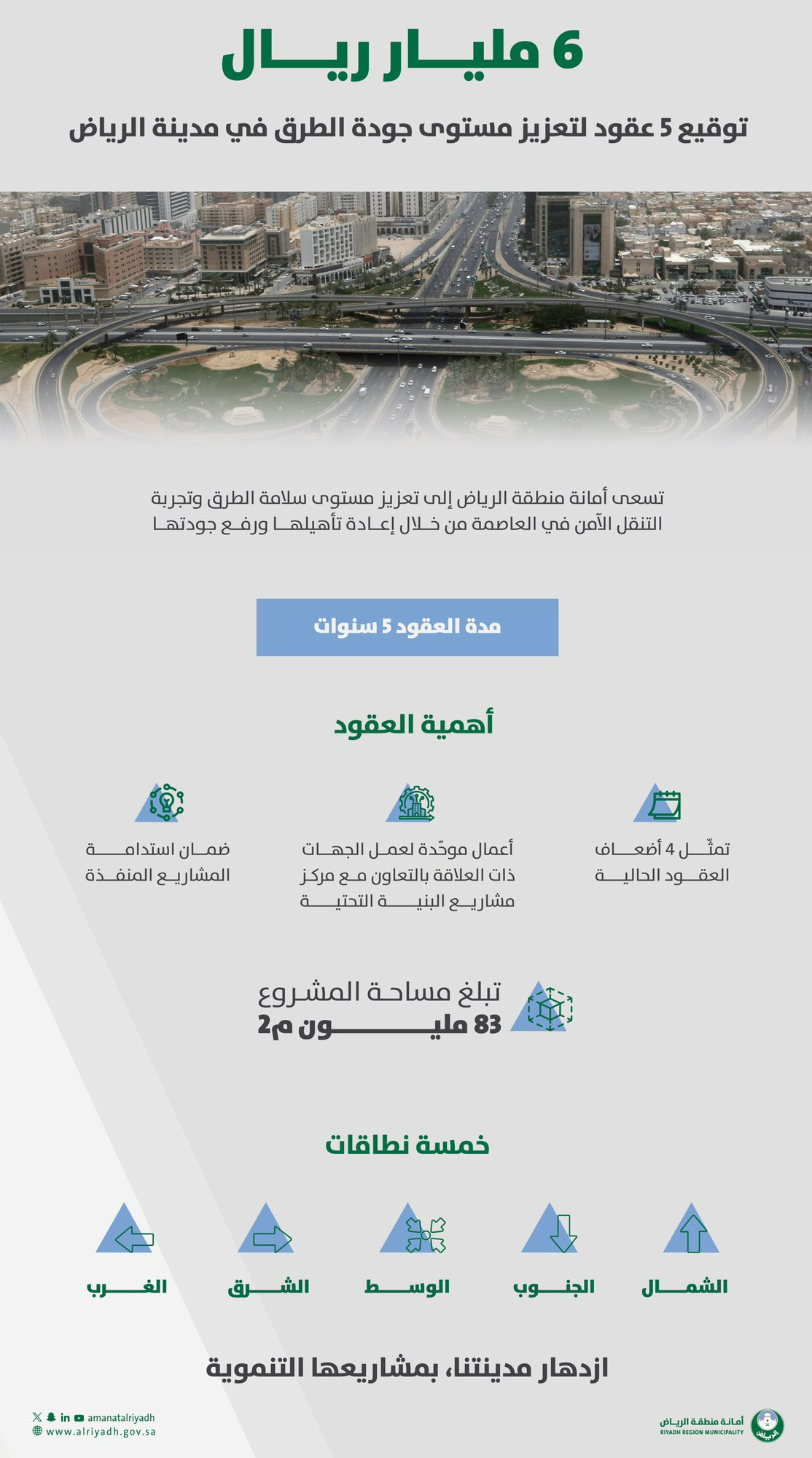 أعلنت أمانة منطقة الرياض، توقيع 5 عقود لرفع جودة الطرق في العاصمة، حيث بلغت مساحة العمل ضمن نطاق العقود 83 مليون متر مربع ولمدة 5 سنوات.