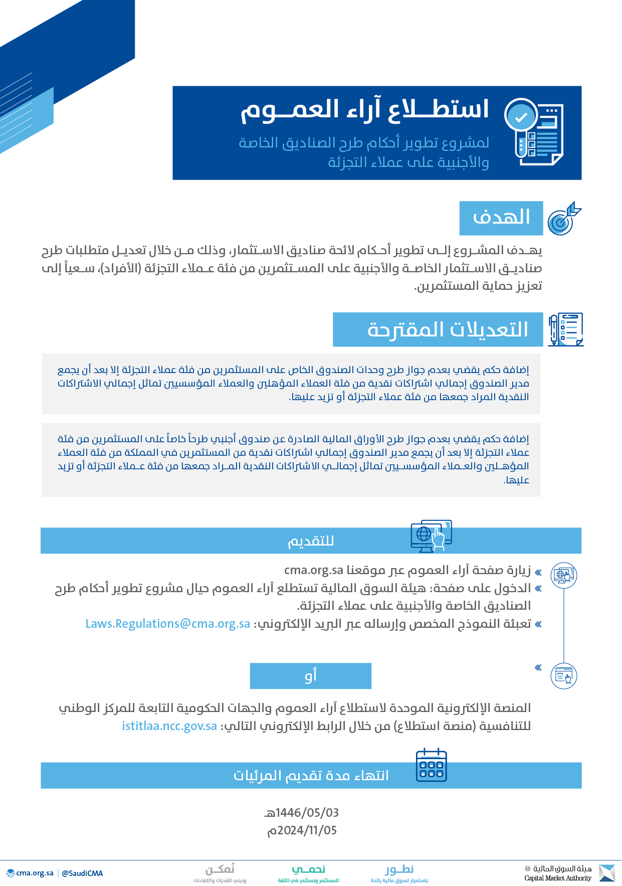 وذكرت أنه يمكن إبداء الملاحظات من خلال الوسائل التالية: المنصة الإلكترونية الموحدة لاستطلاع آراء العموم والجهات الحكومية التابعة للمركز الوطني للتنافسية (منصة استطلاع)، أو من خلال النموذج المخصص لذلك عبر البريد الإلكتروني: Laws.Regulations@cma.org.sa.