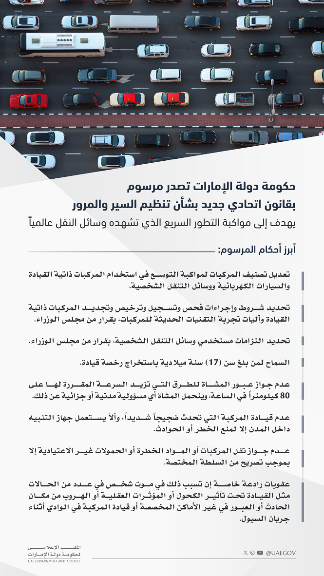 حكومة الإمارات تصدر مرسوم بقانون اتحادي بشأن تنظيم السير والمرور