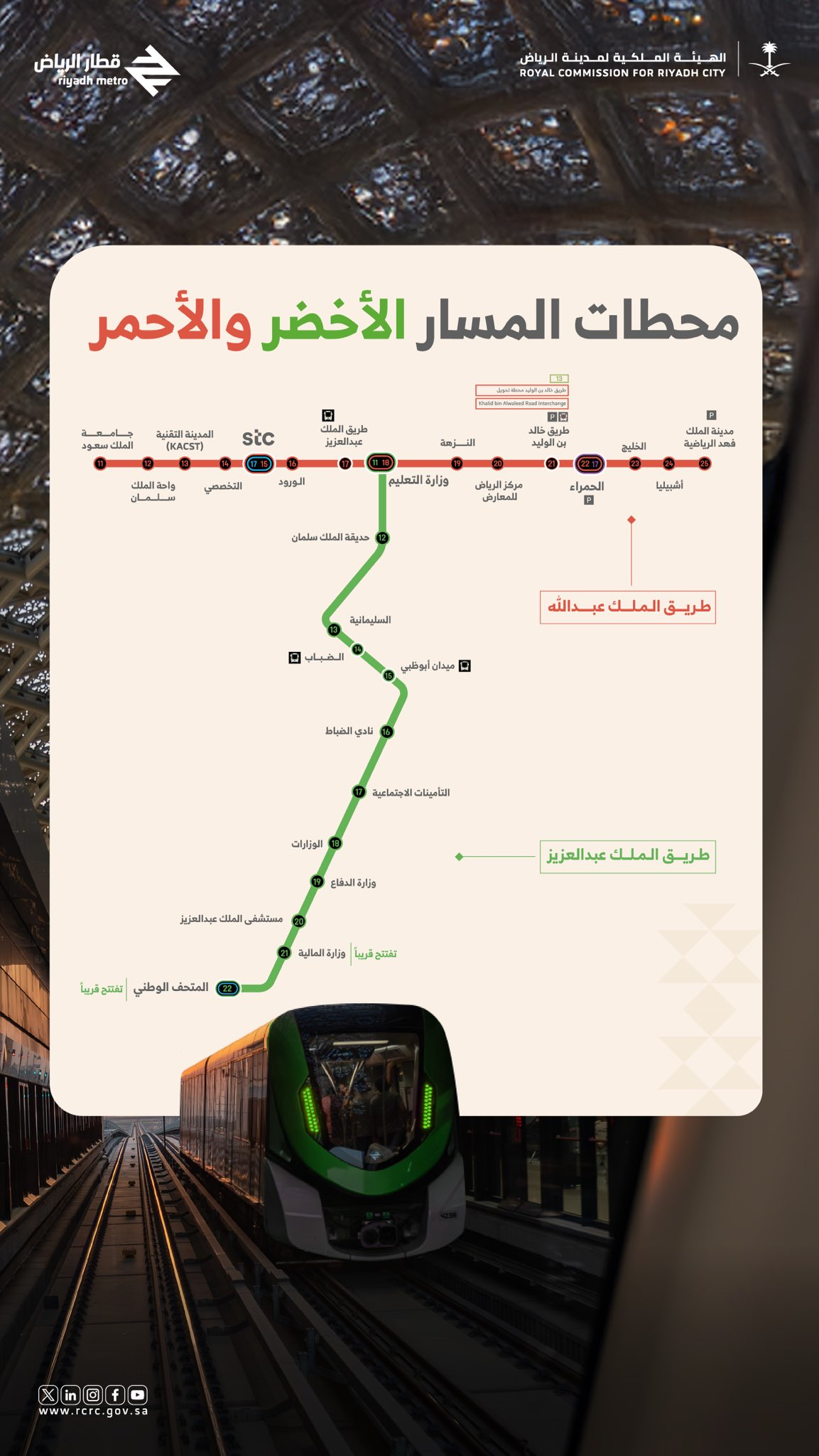 يبدأ اليوم الأحد الموافق 15 ديسمبر 2024، تشغيل المسار الثاني: الأحمر، والمسار الخامس: الأخضر، (طريق الملك عبدالعزيز)، بقطار الرياض.
