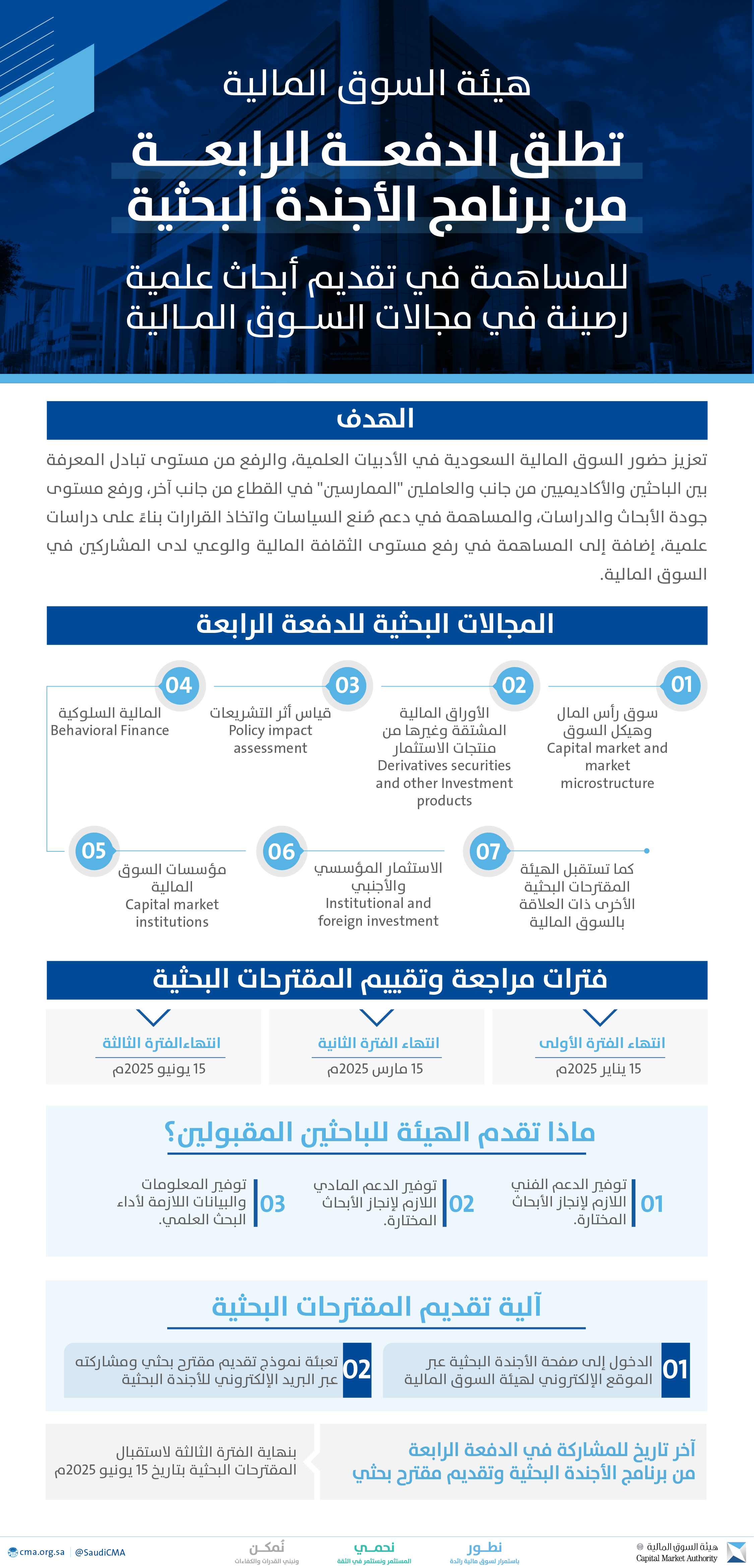 اعلنت هيئة السوق المالية إطلاق الدفعة الرابعة من برنامج الأجندة البحثية 2025م، بحلته الجديدة والشاملة على استحداث اللجنة العلمية المشكلة من قبل مجلس الهيئة في يوليو الماضي، والتعديل على آلية استقبال المقترحات البحثية لتكون على 3 فترات خلال العام، بالإضافة إلى تحديد عدد من المجالات البحثية المقترحة للنسخة الرابعة.