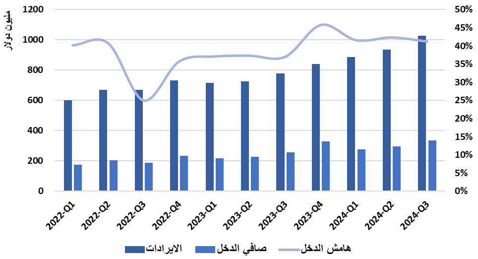 والرسم البياني التالي يوضح تطور الإيرادات وصافي الدخل وهامش الدخل منذ بداية العام 2022: