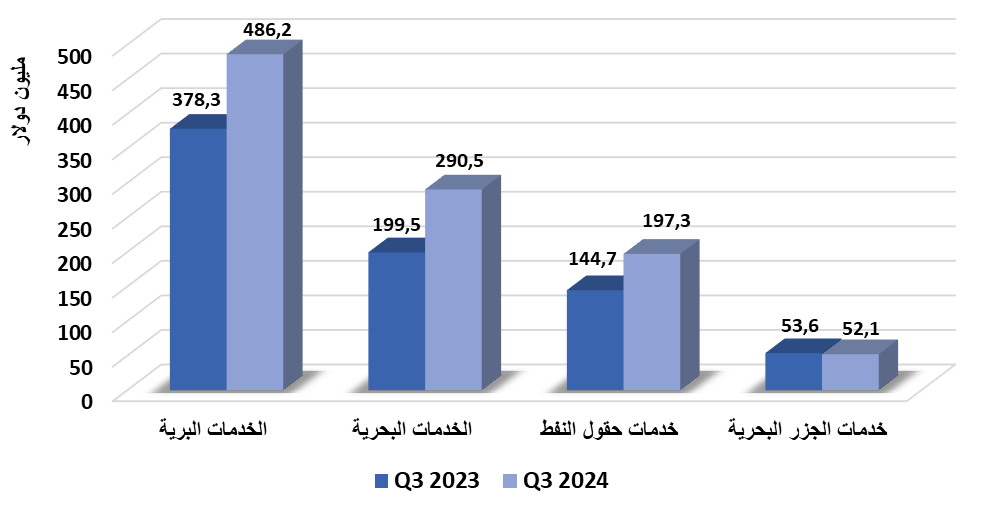 أما على صعيد الأرباح فقد ارتفعت أرباح غالبية القطاعات التشغيلية، نتيجة ارتفاع الإيرادات، حيث تصدر قطاع "الخدمات البرية" الأكثر ارتفاعًا من حيث حجم الأرباح بمقدار 50.1 مليون دولار عن الربع المماثل لتصل إلى 186.5 مليون دولار، مقابل 136.4 مليون دولار خلال الربع الثالث 2023.