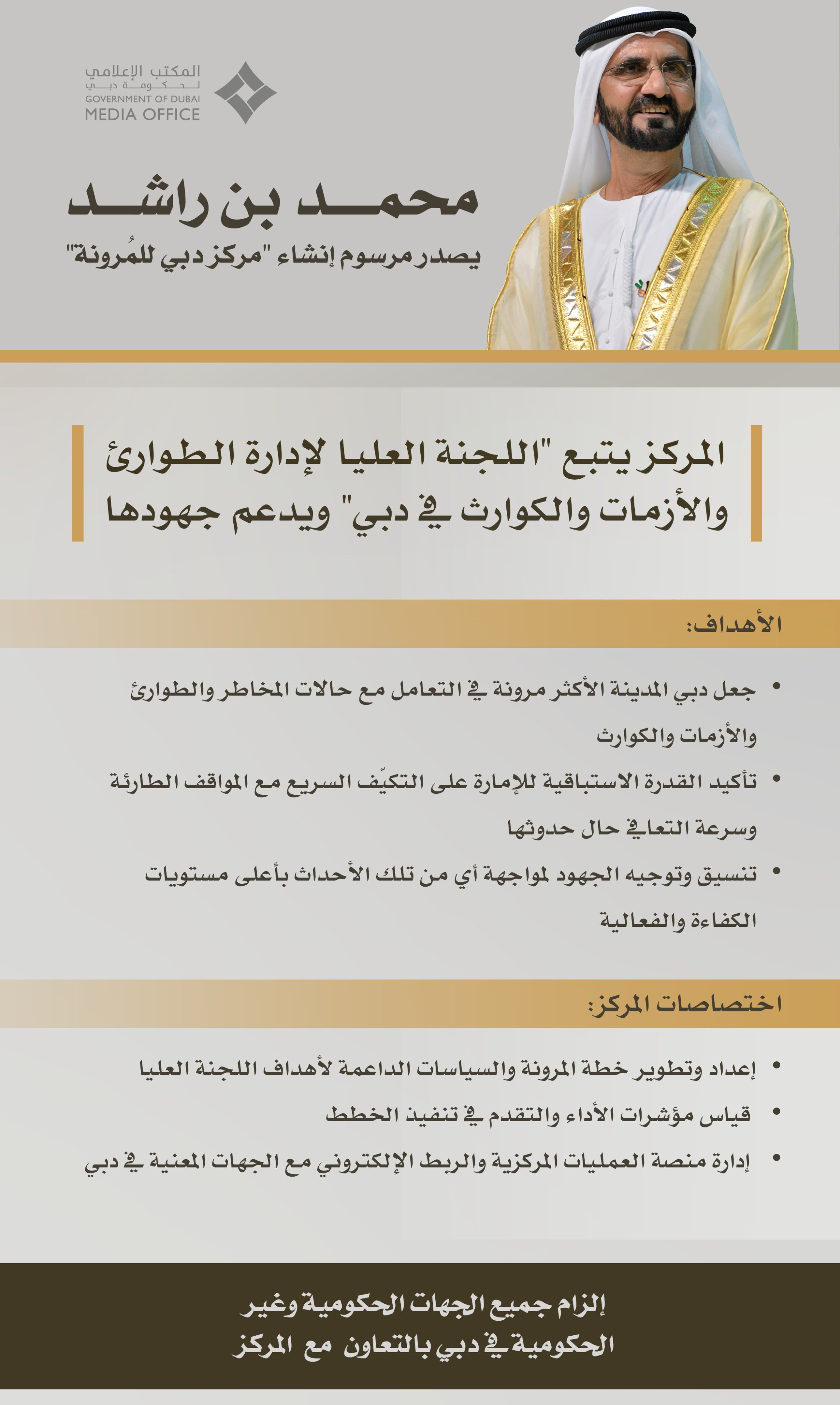 ووفقا للمكتب الإعلامي لحكومة دبي، يتبع مركز دبي للمُرونة، اللجنة العليا لإدارة الطوارئ والأزمات والكوارث في دبي.