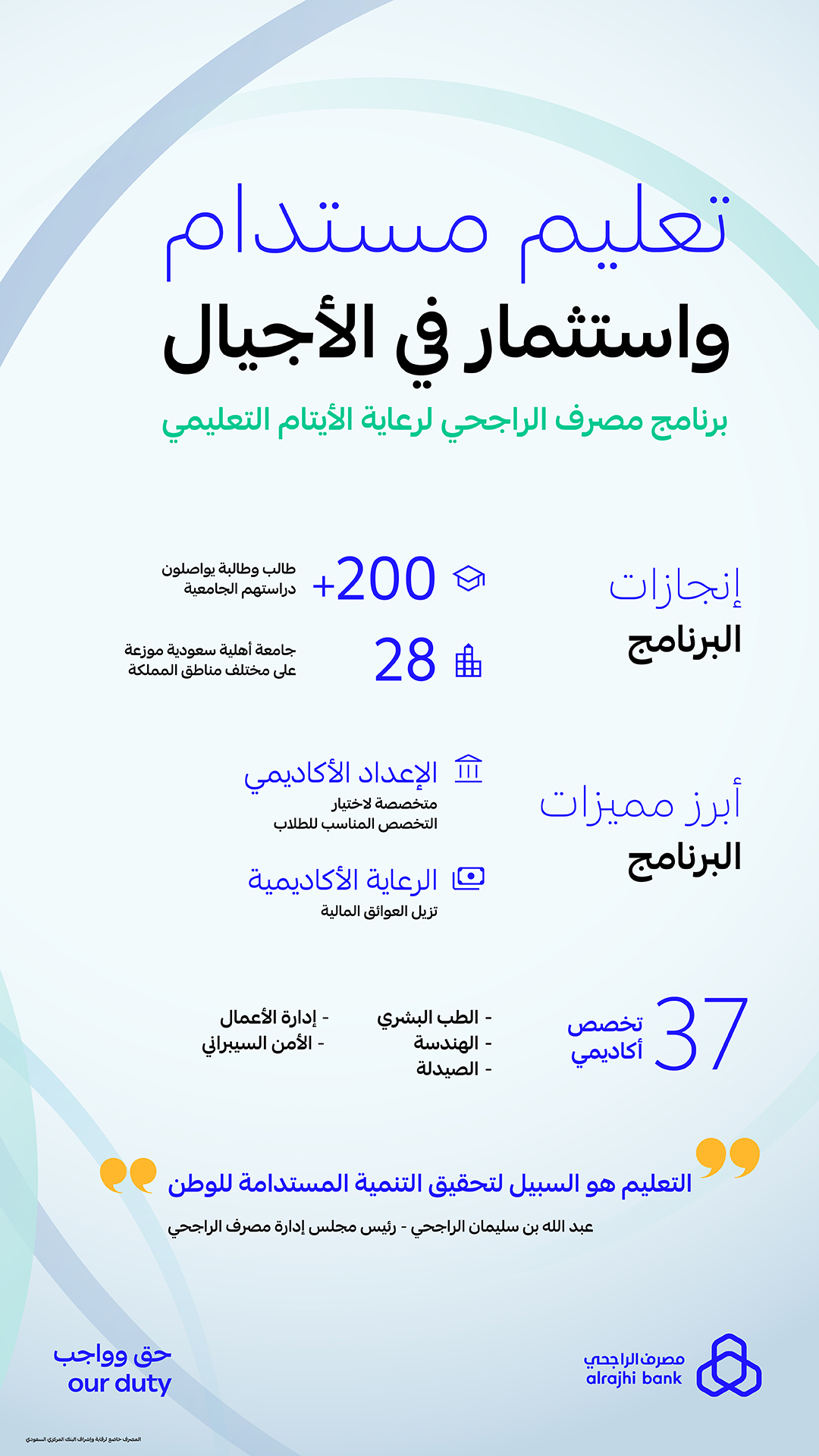 ضمن دور مصرف الراجحي في المسؤولية الاجتماعية لتحقيق مبدأ التكافل الاجتماعي؛ يواصل أكثر من 200 طالب وطالبه مسيرتهم الدراسية ضمن "برنامج مصرف الراجحي لرعاية الأيتام التعليمي" في الجامعات الأهلية على مستوى المملكة بعد أن أكملوا برامج الإعداد الجامعي المعدة لهم والاختبارات التي ساعدتهم في تحديد ميولهم المهنية واختيار التخصصات المناسبة لقدراتهم.