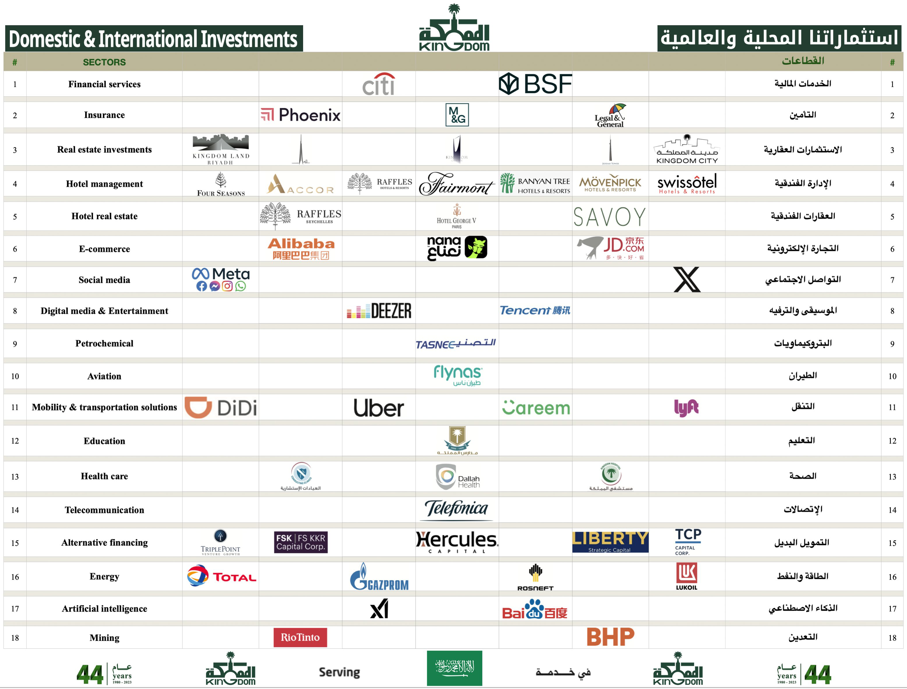 وملكية الشركة في شركة إكس، مع شريكها وحليفها الاستراتيجي إيلون ماسك، وهي الشركة الأقوى حالياً في التواصل الاجتماعي باستثمارات تتعدى الملياري دولار أمريكي أي أكثر من 8 مليارات ريال، والمجموعة تعد ثاني أكبر مستثمر في المجموعة.