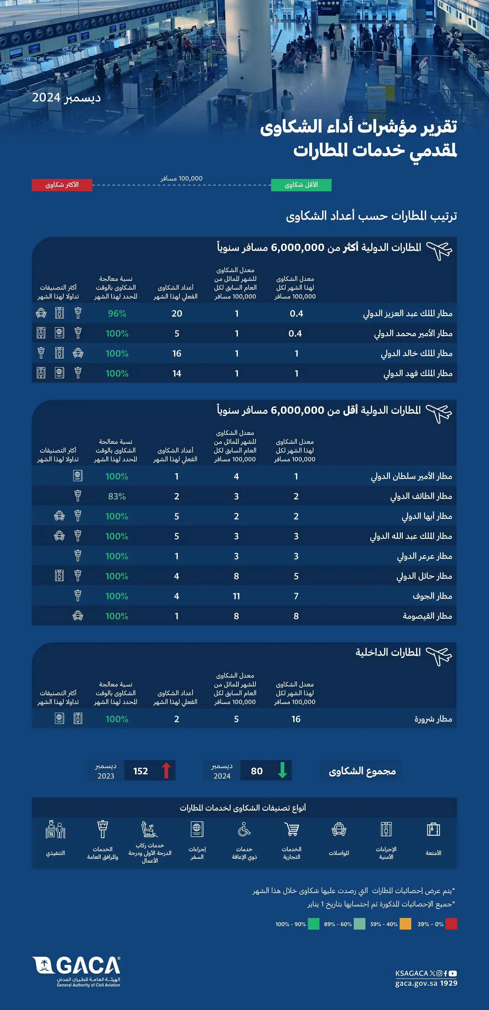 حصل مطار الملك عبدالعزيز الدولي بجدة على أقل المطارات من حيث الشكاوى المرفوعة للهيئة بما نسبته 0.4 % لكل 100 ألف مسافر، وبنسبة معالجة للشكاوى بالوقت المحدد وصلت إلى 96 %.
