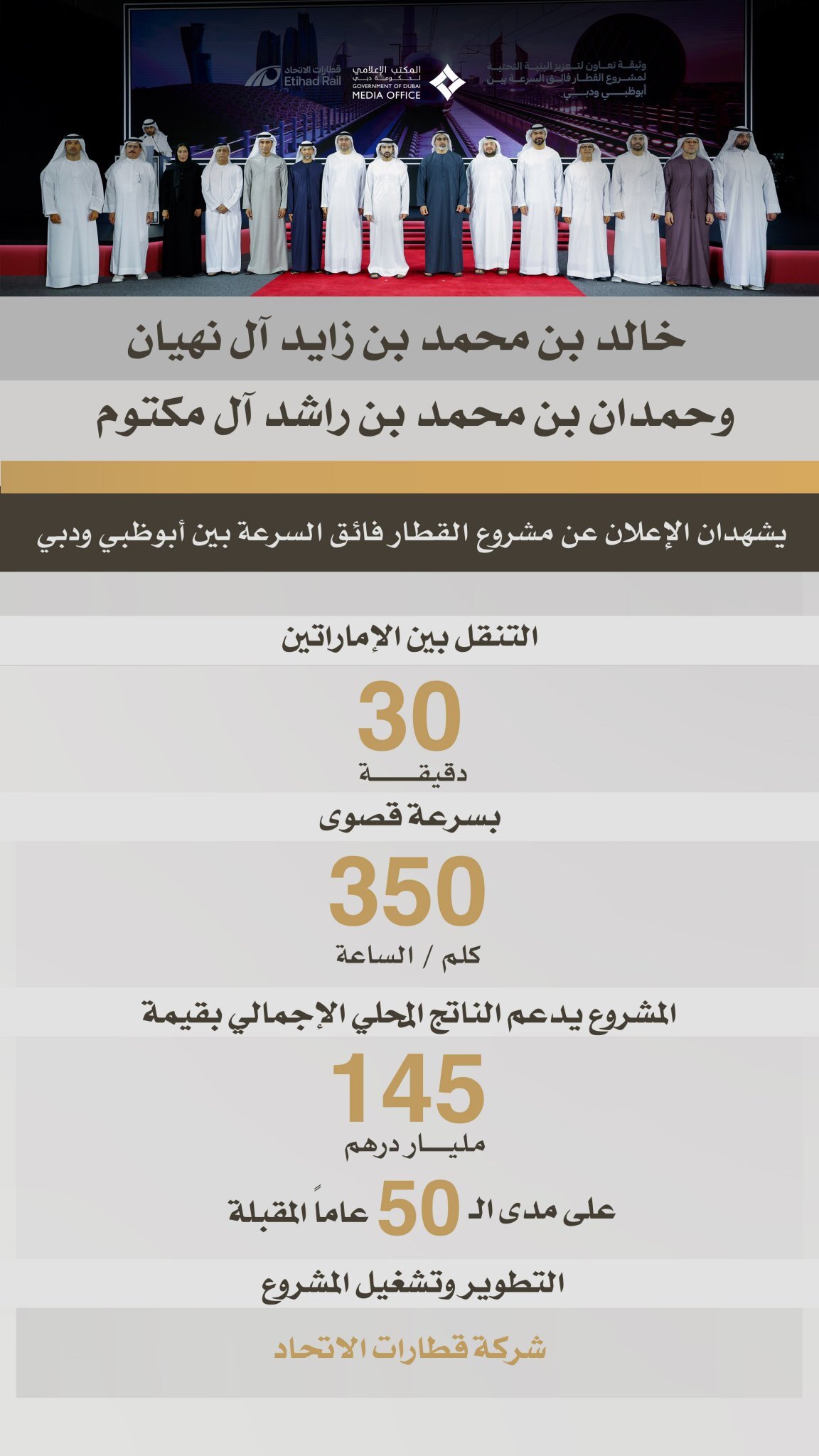 حمدان بن محمد: بمباركة وتوجيهات صاحب السمو الشيخ محمد بن زايد آل نهيان وصاحب السمو الشيخ محمد بن راشد آل مكتوم.. شهدت إلى جانب أخي خالد بن محمد بن زايد آل نهيان الإعلان عن إطلاق مشروع القطار فائق السرعة بين أبوظبي ودبي الذي سيتيح التنقّل بين الإمارتين في مدة لا تتجاوز 30 دقيقة… pic.twitter.com/q5rMderrHc