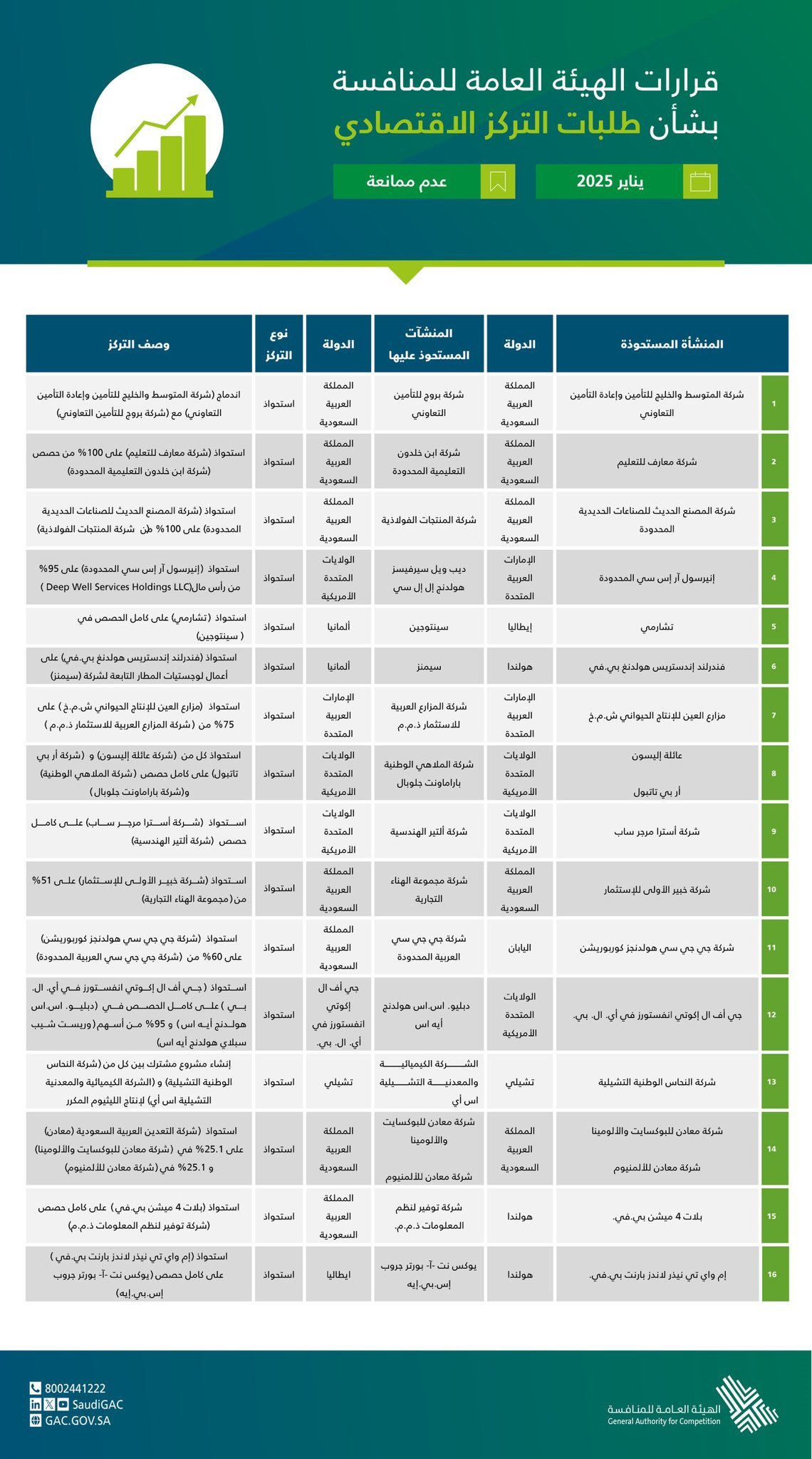 أصدرت الهيئة العامة للمنافسة 16 قراراً بخصوص طلبات التركز الاقتصادي الواردة إليها خلال شهر يناير 2025م.