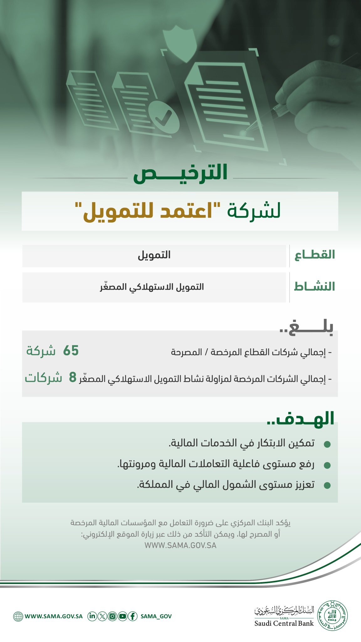 البنك المركزي السعودي يرخص لشركة اعتمد للتمويل لمزاولة نشاط التمويل الاستهلاكي المصغر
