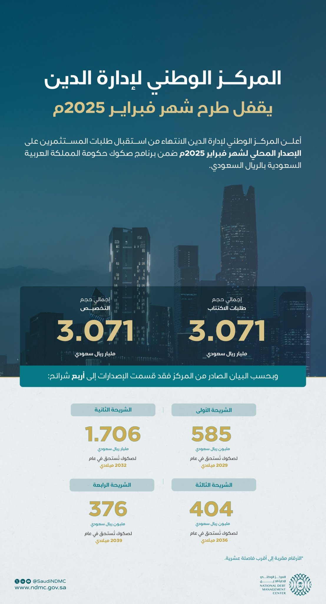 أعلن المركز الوطني لإدارة الدين الانتهاء من استقبال طلبات المستثمرين على الإصدار المحلي لشهر فبراير 2025م ضمن برنامج صكوك حكومة المملكة العربية السعودية بالريال السعودي.