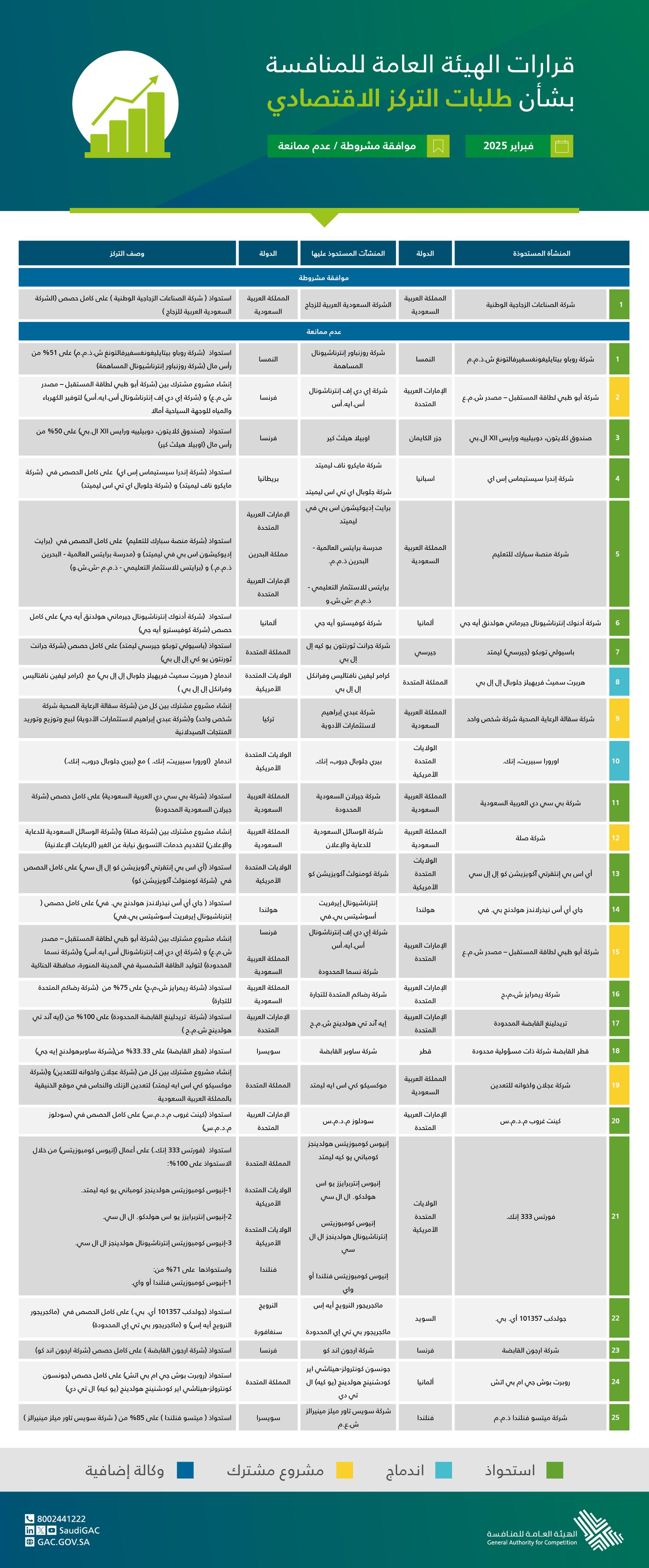 هيئة المنافسة تُصدر 26 قراراً حول طلبات التركز الاقتصادي لشهر فبراير 2025
