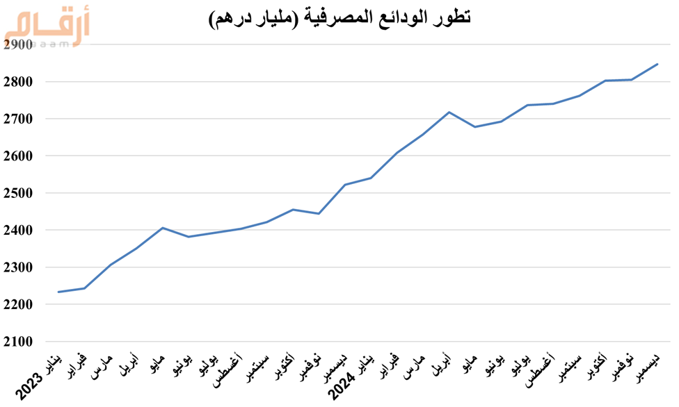 ووفقا لأحدث إحصائيات مصرف الإمارات المركزي، ارتفعت الودائع المصرفية إلى 2847 مليار درهم بنهاية ديسمبر 2024، وبـنسبة 13% مقارنة بنفس الفترة من عام 2023، وارتفعت بقيمة 42.6 مليار درهم مقارنة بشهر نوفمبر الماضي.
