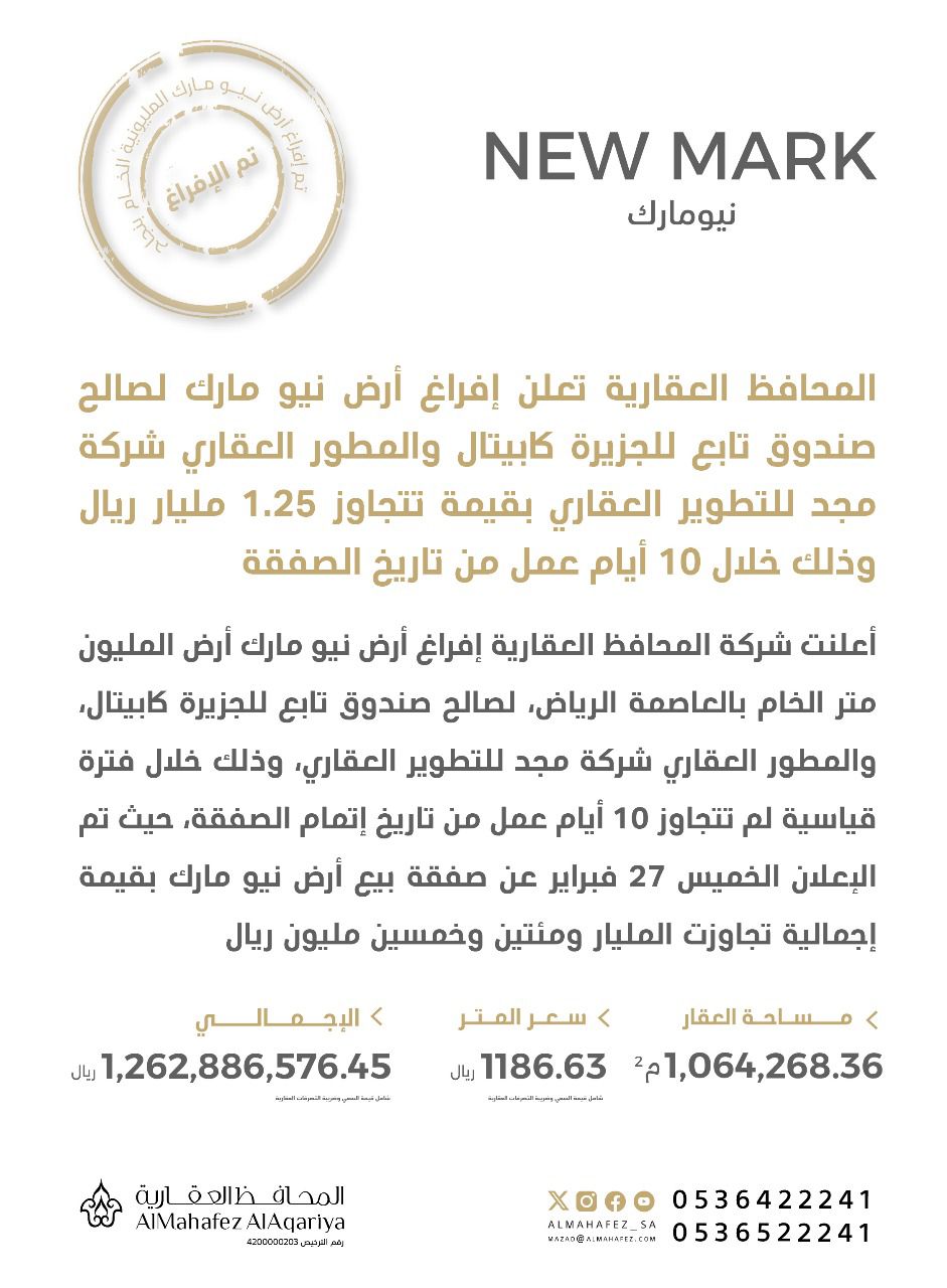 المحافظ العقارية تعلن إفراغ أرض New Mark لصالح صندوق تابع للجزيرة كابيتال والمطور العقاري شركة مجد للتطوير العقاري بقيمة تتجاوز 1.25 مليار ريال وذلك خلال 10 أيام عمل من تاريخ الصفقة