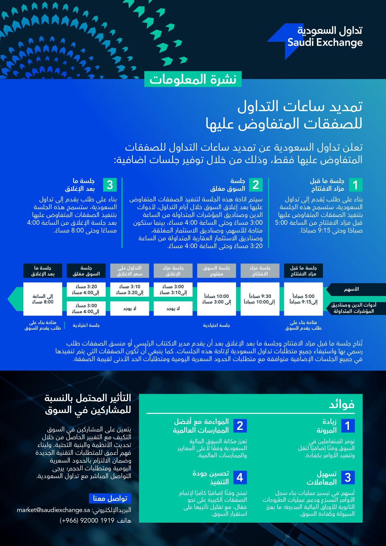 3- جلسة ما بعد الإغلاق: بناءً على طلب يُقدم إلى تداول السعودية، ستسمح هذه الجلسة بتنفيذ الصفقات المتفاوض عليها بعد جلسة الإغلاق من الساعة 4:00 مساءً وحتى 8:00 مساءً.