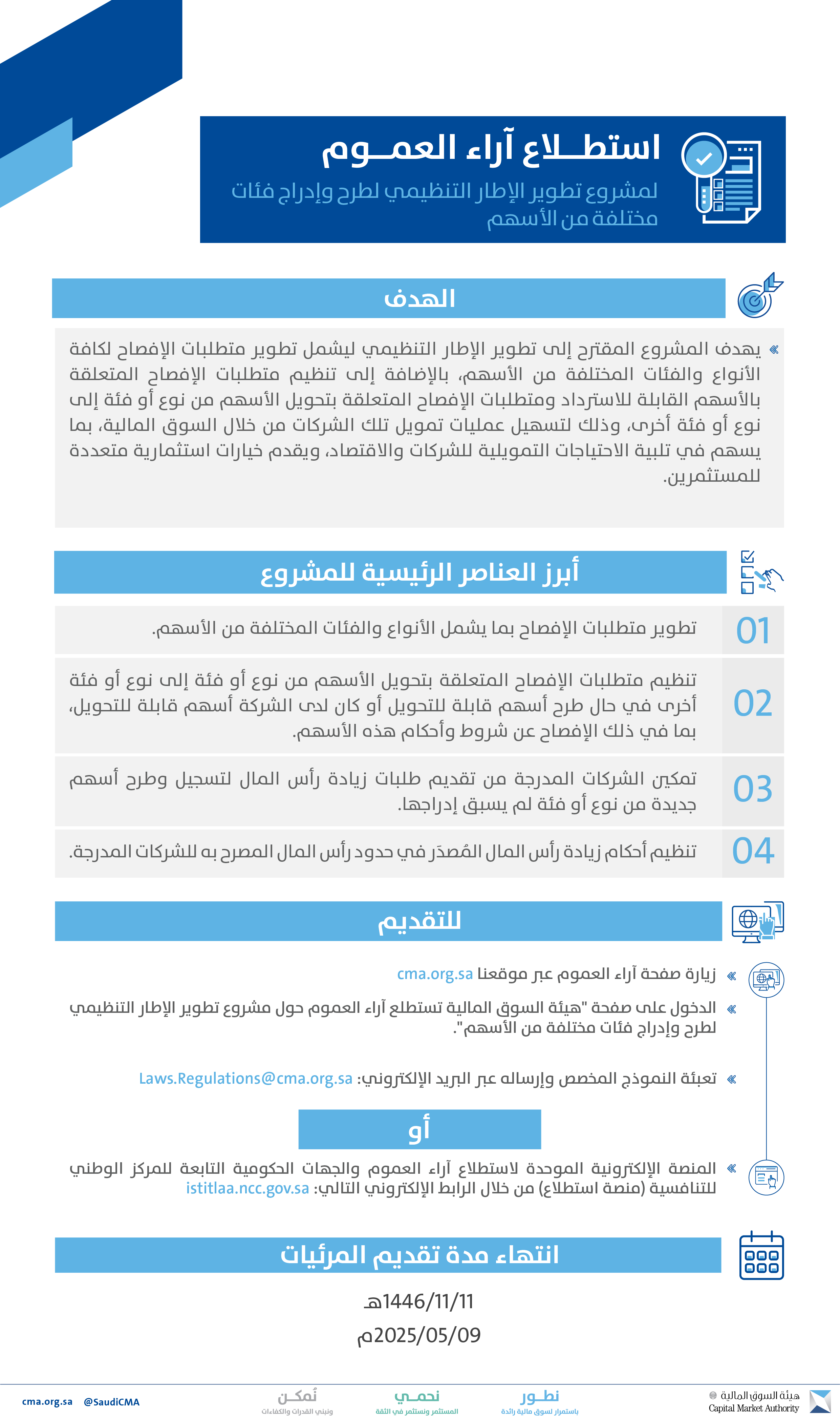 دعت هيئة السوق المالية عموم المهتمين والمعنيين والمشاركين في السوق المالية لإبداء مرئياتهم حيال مشروع تطوير الإطار التنظيمي لطرح وإدراج فئات مختلفة من الأسهم، وذلك لمدة 30 يوماً تنتهي بتاريخ 11 شهر ذو القعدة 1446 هـ الموافق 9 مايو 2025.