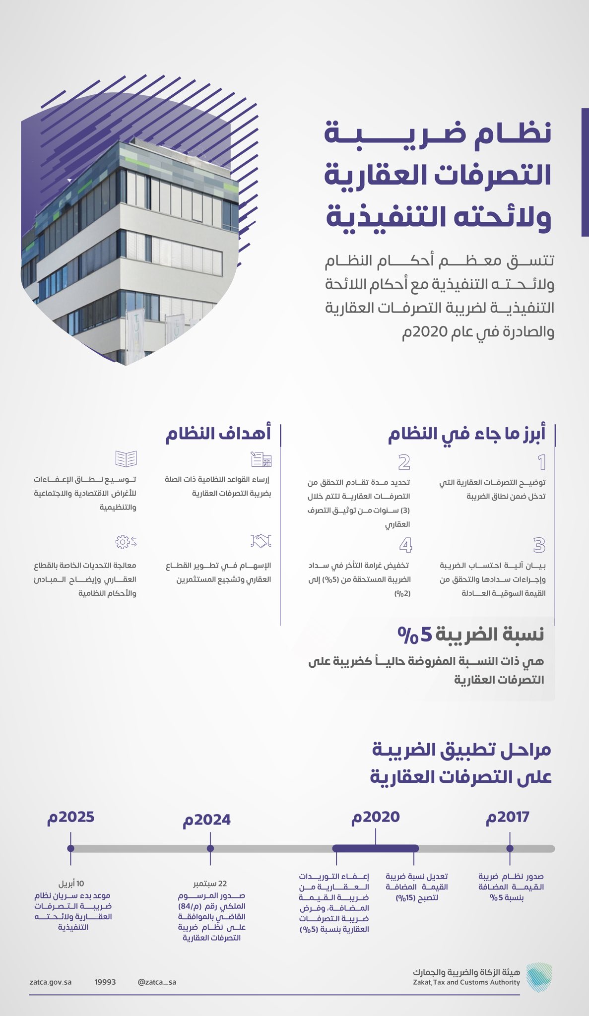 ويهدف النظام إلى إرساء القواعد النظامية ذات الصلة بضريبة التصرفات العقارية، والإسهام في تطوير القطاع العقاري وتشجيع المستثمرين، وتوسيع نطاق الإعفاءات للأغراض الاقتصادية والاجتماعية والتنظيمية، ومعالجة التحديات الخاصة بالقطاع العقاري وإيضاح المبادئ والأحكام النظامية.