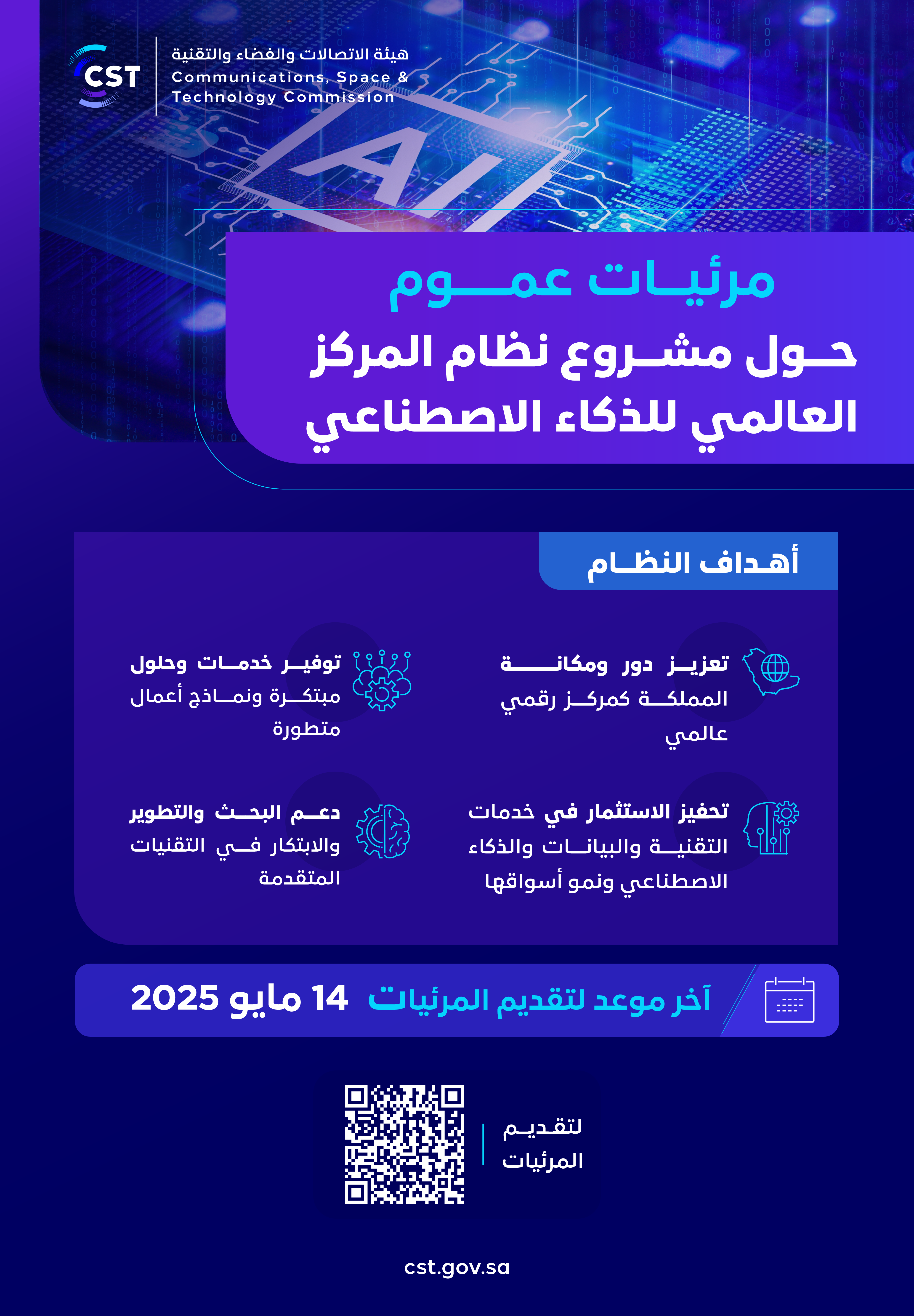 دعت هيئة الاتصالات والفضاء والتقنية، العموم لتقديم مرئياتهم حول مشروع المركز العالمي للذكاء الاصطناعي، والذي يساهم في خلق بيئة تشريعية وتنظيمية جاذبة للاستثمارات النوعية في التقنية بشكل عام ومراكز البيانات والذكاء الاصطناعي بشكل خاص.